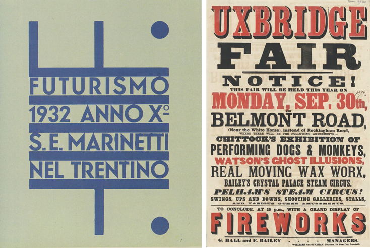 Then there’s the connection to graphic design. The visual trope of justified text aligned at various sizes is common to the whole history of poster design, from 19th century notices and bills on through 20th century Futurism, modernism, and beyond.